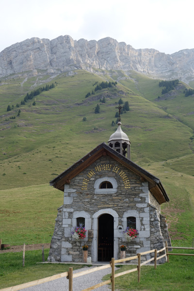 Je scrute le ciel et si les cimes environnantes sont encapuchonnées, le soleil brille sur !a vallée. Plaisante montée vers le col de la Colombiere. La pente est régulière et excède rarement les 6 à 7% ce qui permet de profiter pleinement d’un paysage d’alpages parsemé de chalets en bois aux balcons fleuris. M’en tenant au tracé de la GTA et délaissant la route touristique passant par la col de Romme dont j’ignore le dénivelé, Cluses est vite atteint. La ville n’a rien de romantique et sur les conseils de l’hôtesse de l’office du tourisme je me pose à Tenianges où l’on attend l’orage, une alerte ayant été lancée. Il viendra dans la soirée avec vigueur mais sans trop mettre à l’épreuve l’étanchéité de ma tente.