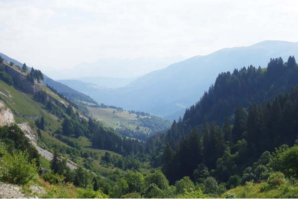La montée vers Les Gets n’est pas impérissable. Se déployant dans une vallée encaissée et pas vraiment pittoresque, elle présente pour seul avantage d’offrir une pente régulière et modérée. Elle est par contre le lieu d’une intense circulation. Sans doute par beau temps eusse-je apprécié l’ombre bienfaitrice des arbres qui la bordent.
