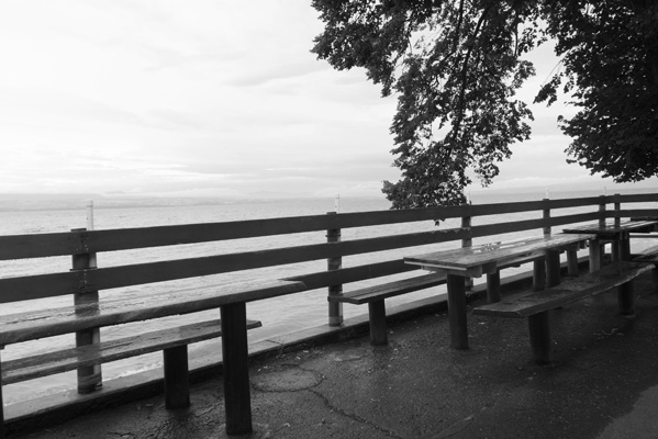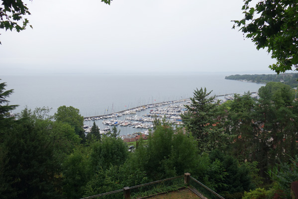 Parvenu a Thonon, la pluie n’est plus que gouttes éparses et j’entreprends le circuit du Bas Chalonnais, qui sur la carte borde le lac. Sans doute suis-je dans un mauvais jour et je ne trouve aucun intérêt à ce circuit qui, de fait, chemine entre des propriétés cossues et ne donne accès au lac qu’au seul endroit des ports. Lassé, je cesse de le suivre et file plus directement sur Annemasse.