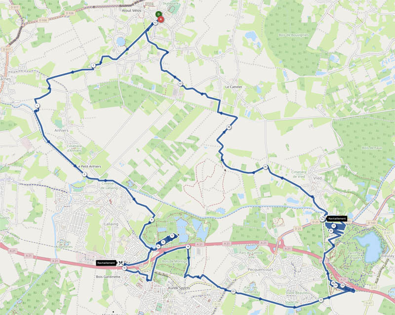 Ceux de Pecquencourt et Rieulay, qui s’enchaînaient, proposaient des traces plus animées, riches en bosses et monotraces. Les ressources des deux terrils furent pleinement exploitées, comme le laisse deviner l’image de la trace, ramassée à forces de sinuosités.