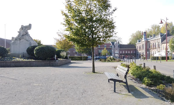 Un banc au soleil sur la place de Steenwerck, idéal pour pique-niquer.