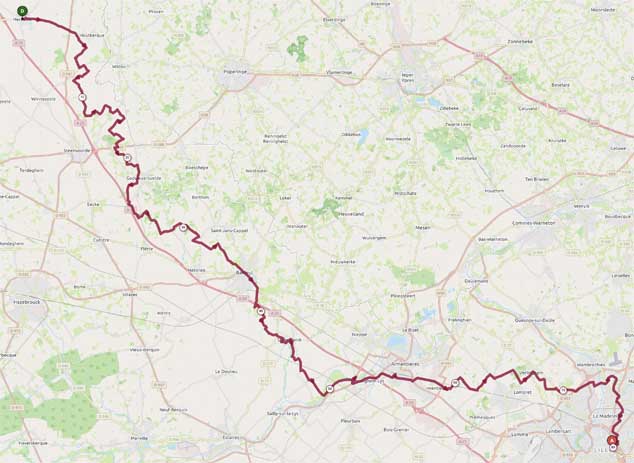 Comme souvent, c’est l’occasion qui fait le larron et dans la circonstance la randonnée. L’opportunité de mettre mon vélo dans une voiture en direction d’Herzeele me fit imaginer un itinéraire de retour vers Lille. Ma saison VTT ayant débuté, j’optai pour un parcours privilégiant les chemins. Mais, difficile en introduisant la contrainte supplémentaire de rester en France de faire mieux que 25% de chemins, sauf à rallonger l’itinéraire en empruntant les berges de la Lys puis de la Deûle à partir d’Erquinghem-Lys.