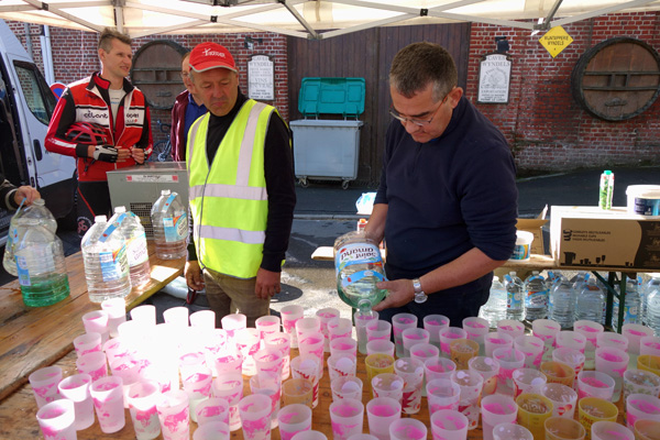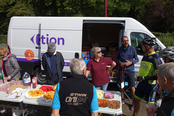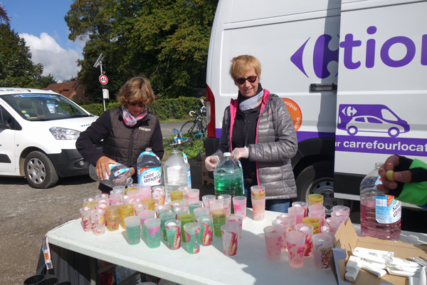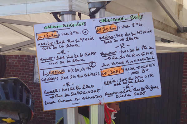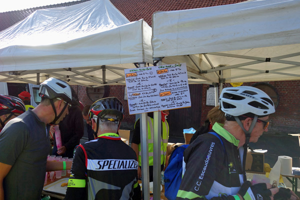 Premier passage au ravitaillement de Boeschepe.Presque la célébrité.Consignes pour les ravitailleurs. Heures de passages attendues et orientation, ce ravitaillement étant commun à deux circuits avec un second passage pour le 126 km.Bon point pour l’organisation, l’utilisation de gobelets lavables. A reproduire dans les autres brevets.Ravitaillements variés et copieux.Ce n’est pas tous les jours que le géant est de sortie. Cela mérite une photo.En route vers le Mont des Recollets avec le vent de face. Ce n’était pas la partie la plus facile.La montée de Cassel avec le sourire.Pas très sûr que ces deux photos suivent la chronologie.Ravitaillement de Sainte Marie Cappel.D’ici peu, Route et Défi des Monts se sépareront.Panorama connu mais apprécié vu haut du Mont des Cats.Entre Boeschepe et le Mont Rouge.Facétie du réglage d’exposition, mieux vaut passer en noir et blanc.