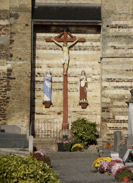 Pour voir ce calvaire, il faudra faire un détour. C’est un panneau manqué qui me fera remarquer, revenant sur mes pas, ce calvaire situé en retrait de la route (près de l’intersection entre la rue Eugène Fievet et la rue Jean Jaures). J’aime particulièrement la lumière qui l’éclaire. Avec les nuages, la luminosité est très changeante et un paysage vivement éclairé devient subitement terne. Il faut être là au bon moment et rapide à sortir l’appareil de son étui. Je me suis arrêté plusieurs fois, en vain, n’ayant pas la patience d’attendre qu’un épais cumulus venu soudainement obscurcir une scène daignât poursuivre son chemin.