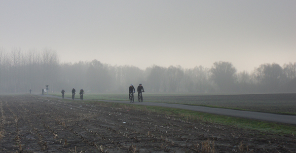 La faible luminosité n’aura pas permis des photos de cyclistes en mouvement. Le temps d’obturation trop long les rendra floues.Ravitaillement à Wulvergem.Eclaircie pour le retour à NieuwkerqueDe nouveau la pluie en suivant la Lys vers Frelinghien.