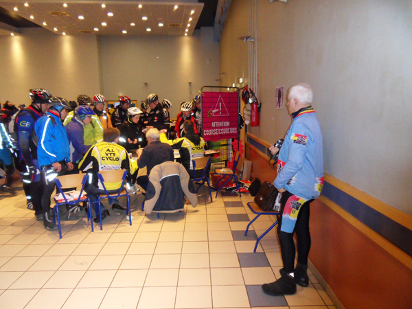 Dehors, l’homme chicon distribue comme d’habitude des bulletins d’inscription, tandis que les cyclos s’appliquent à bien positionner leur plaque de cadre.