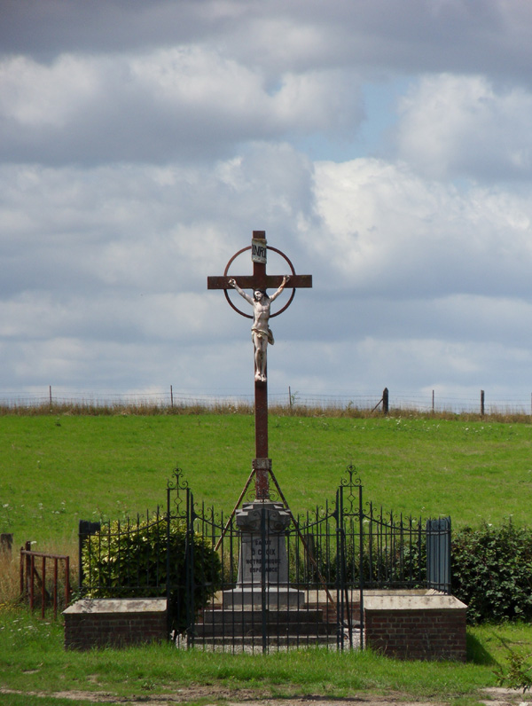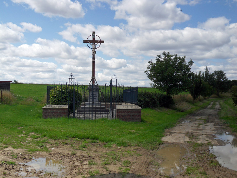 Pour voir ce calvaire, il faudra faire un détour. C’est un panneau manqué qui me fera remarquer, revenant sur mes pas, ce calvaire situé en retrait de la route (près de l’intersection entre la rue Eugène Fievet et la rue Jean Jaures). J’aime particulièrement la lumière qui l’éclaire. Avec les nuages, la luminosité est très changeante et un paysage vivement éclairé devient subitement terne. Il faut être là au bon moment et rapide à sortir l’appareil de son étui. Je me suis arrêté plusieurs fois, en vain, n’ayant pas la patience d’attendre qu’un épais cumulus venu soudainement obscurcir une scène daignât poursuivre son chemin.