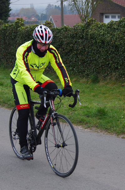 La fabrication des sandwichs est en cours. Je n’y goûterai pas, rentrant directement pour éviter de trouver ma femme en hypoglycémie.Beau choix de parcours « route », plusieurs distances étaient également proposées pour le VTT.Pas de photos avant le ravitaillement.Les nieppois ont commis une erreur d’aiguillage, ce qui me permet de les rattraper.Il n’est que/déjà 9h35, j’opte pour le 75 km.Montée courte mais raide dont la chaussée à été fraichement refaite.La même mais cadrée différemment et en noir et blanc, pas la même ambiance.Un coup d’œil en arrière m’aura fait apercevoir des participants, tant pis pour le cadre « urbain ».Il était hier à la randonnée au départ de Mouvaux, mais ne s’est pas encore vu en photo, c’est prévu pour la deuxième partie qui n’est pas encore en ligne.Nous les reverrons encore.Retour en forêt et au ravitaillement.Le calme sylvestre sera un temps troublé par un rallye touristique de Porsches pétaradantes et aux émanations nauséabondes.Sage précaution que de signaler les traversées de batraciens. Nettoyer un dérailleur englué dans des viscères de crapauds ne doit rien avoir de plaisant.Dernier passage.Pas vraiment de quoi s’abriter du vent.Sauf quand on roule à deux.
