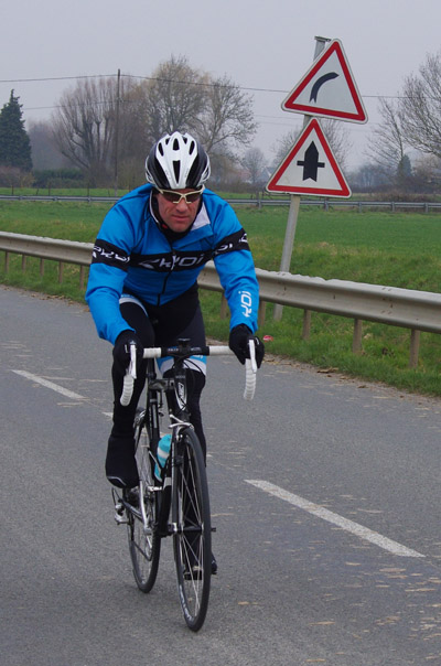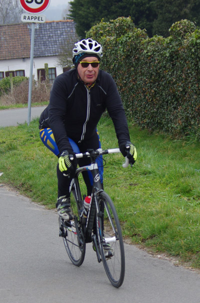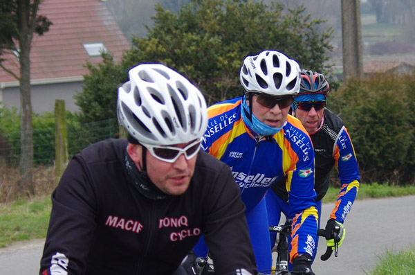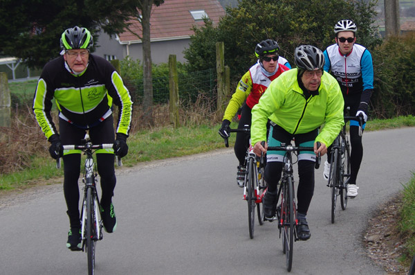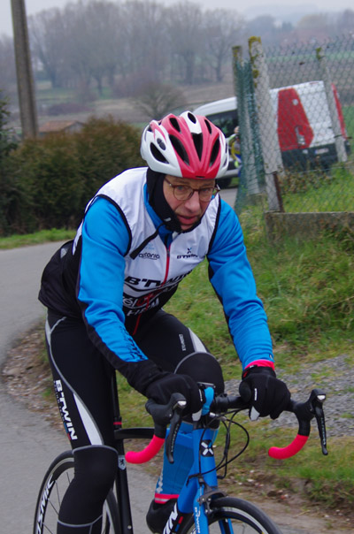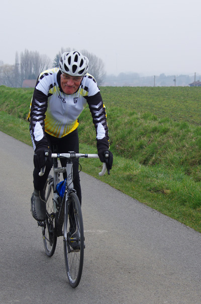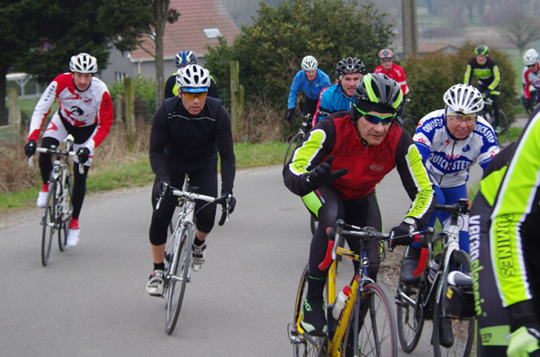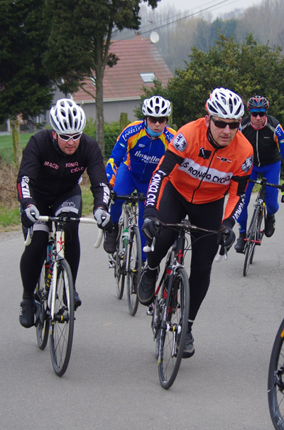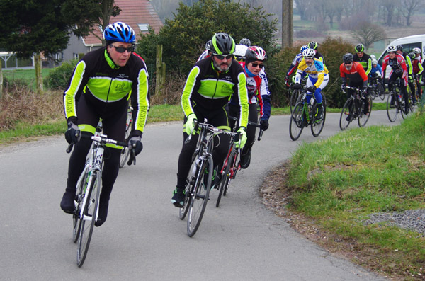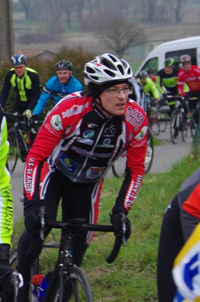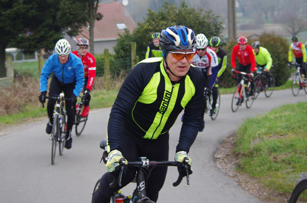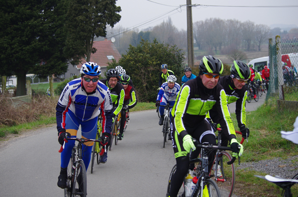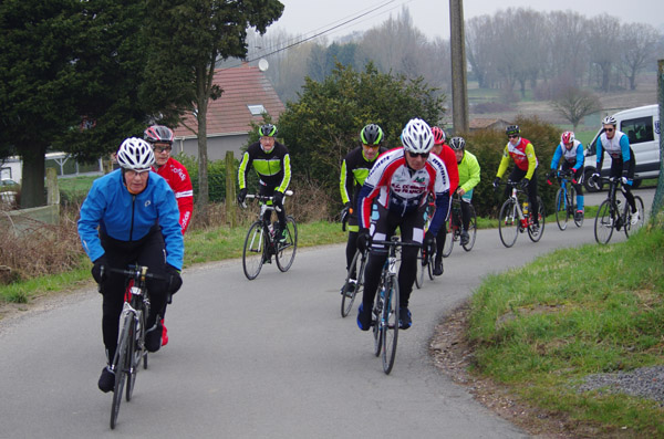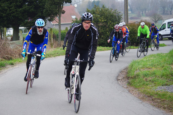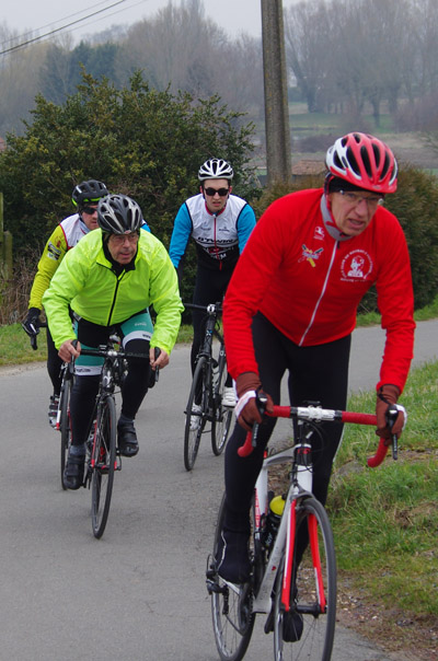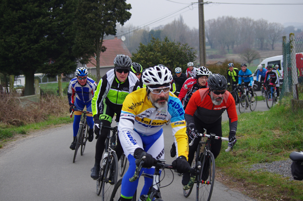 Des roubaisiens en attente de leurs collègues en ont profité pour apposer des affiches pour le prochain Paris-Roubaix cyclo du 10 juin et plus proche, la randonnée VTT nocturne du 06 avril au départ de Willems.Certes la randonnée en bleu et jaune se déroulait aussi ce dimanche, mais c’était à Wavrin.Un des premiers Linsellois.Ayant utilisé deux appareils, les photos sont en partie dans le désordre, le renommage de fichiers multiples s’effectuant dans Photoshop d’après les noms de fichier.37 Linsellois avaient fait le déplacement.L’ayant rattrapé et dépassé dans la suite de la randonnée, j’entraînerai ce cyclo dans mon errance temporaire après que j’ai moi même suivi à tort un cycliste qui me précédait et que je pensais participer au brevet. Conjuguant nos efforts, nous retrouverons rapidement le droit chemin.