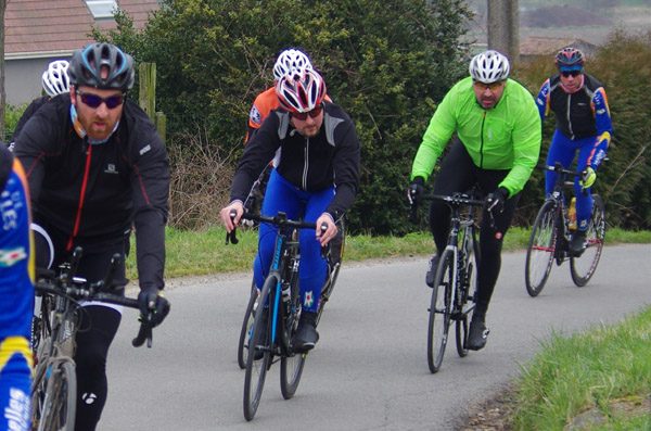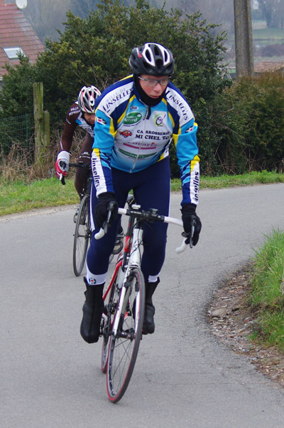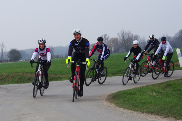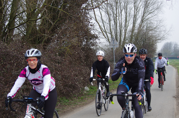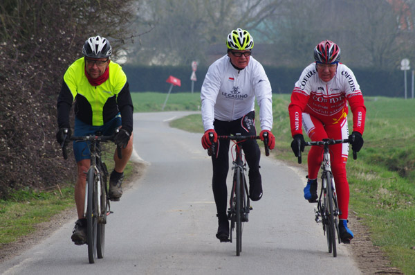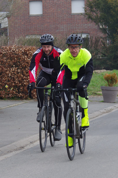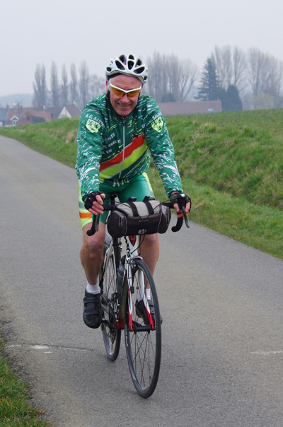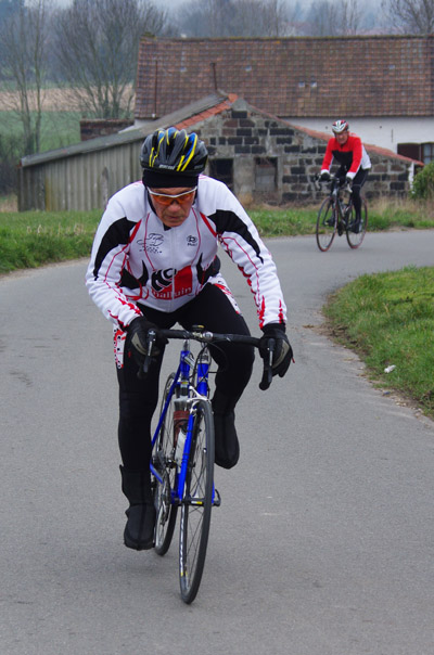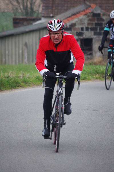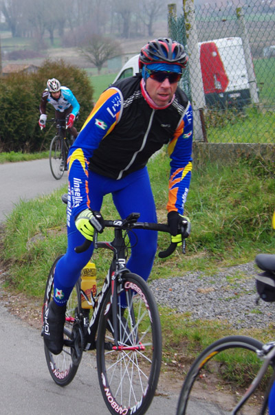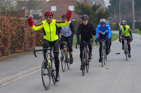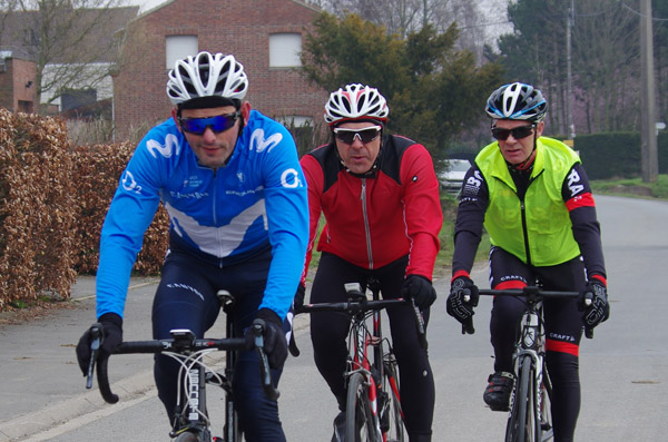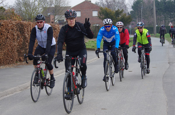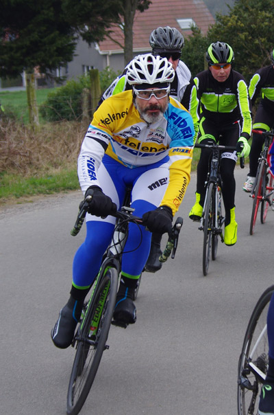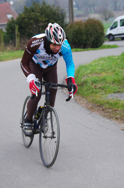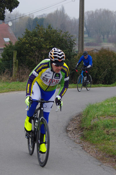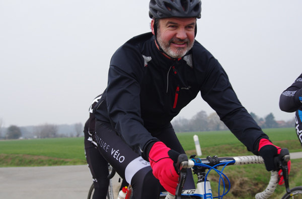 Des roubaisiens en attente de leurs collègues en ont profité pour apposer des affiches pour le prochain Paris-Roubaix cyclo du 10 juin et plus proche, la randonnée VTT nocturne du 06 avril au départ de Willems.Certes la randonnée en bleu et jaune se déroulait aussi ce dimanche, mais c’était à Wavrin.Un des premiers Linsellois.Ayant utilisé deux appareils, les photos sont en partie dans le désordre, le renommage de fichiers multiples s’effectuant dans Photoshop d’après les noms de fichier.37 Linsellois avaient fait le déplacement.L’ayant rattrapé et dépassé dans la suite de la randonnée, j’entraînerai ce cyclo dans mon errance temporaire après que j’ai moi même suivi à tort un cycliste qui me précédait et que je pensais participer au brevet. Conjuguant nos efforts, nous retrouverons rapidement le droit chemin.
