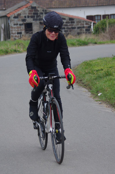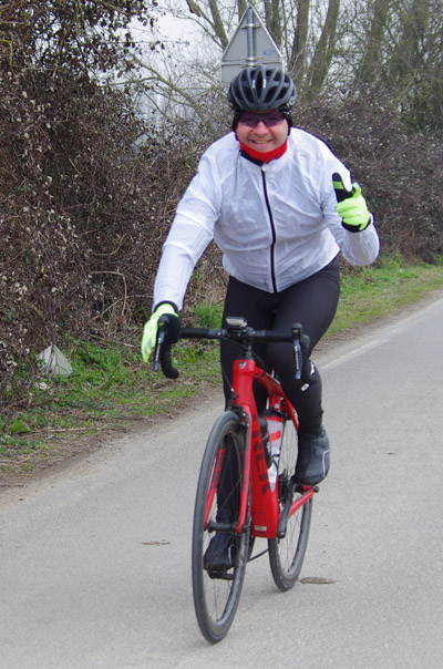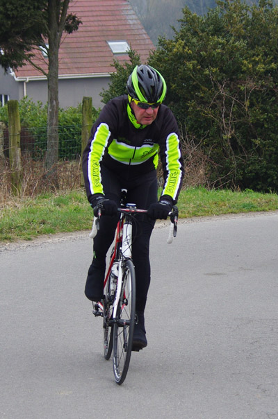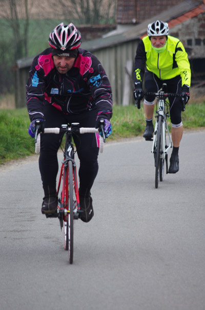 Le soleil dispensant chichement ses rayons, il me fallut opter pour une sensibilité élevée pour saisir les cyclistes filant bon train. Il en résulte un grain plus marqué. Un réglage imparfait dans les toutes premières prises de vue et un autofocus moins performant en basse lumière font que certains, bien que souriants et m’adressant de sympathiques signes de la main ne se retrouveront pas dans les clichés mis en ligne. J’en suis désolé.