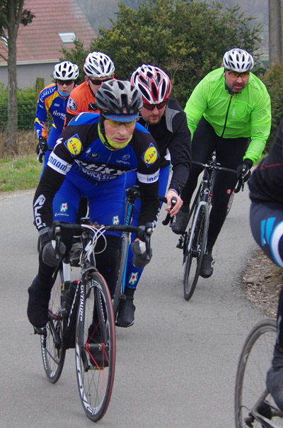 Reste encore la côte de Werwicq comme dernière difficulté.« Sans les mains », cela me rappelle une histoire de cour d’école qui se finit chez le dentiste.Second ravitaillement.Explications sur la suite du parcours.