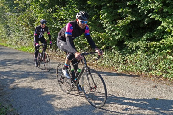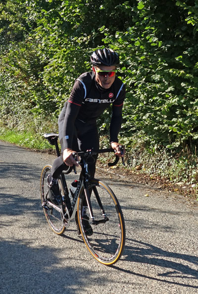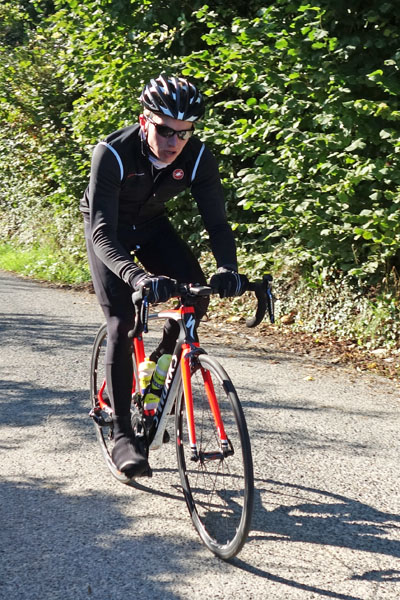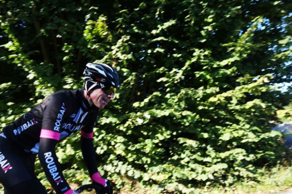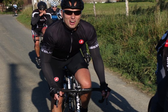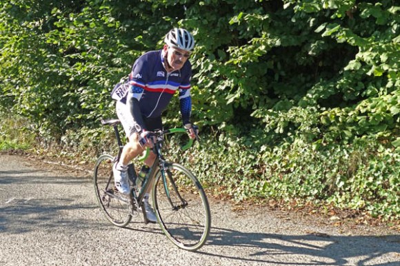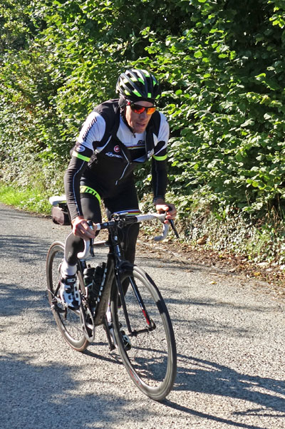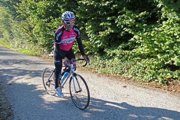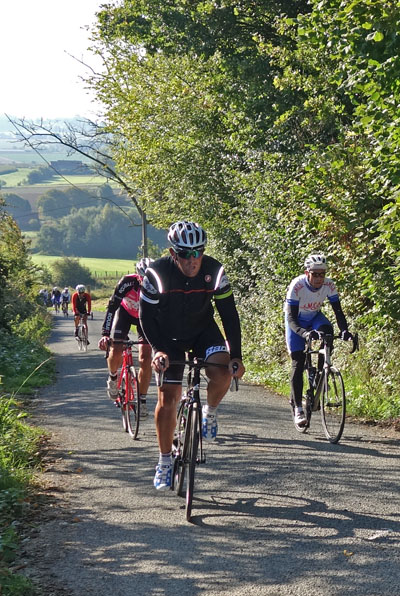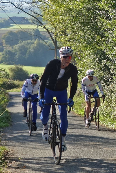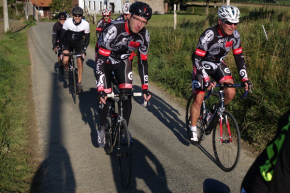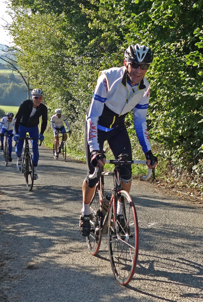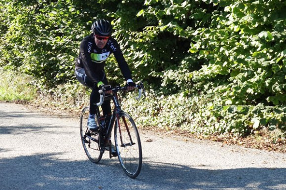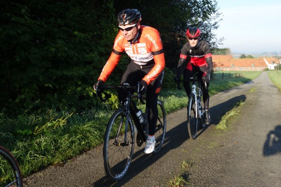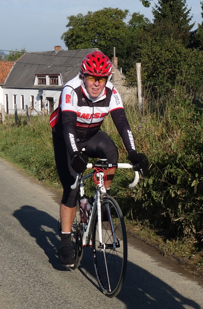 Echanges à propos du rétroviseur de casque ce cycliste du club de Mouvaux.