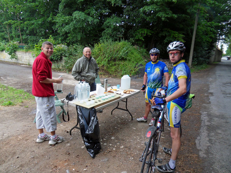 La première demi-heure se passe sous une forte pluie et mon coupe vent commence à montrer ses limites en matière d’étanchéité. Je me prends à penser que si le temps n’évolue pas, le 80 km pourra constituer un plan B honorable. Mais aussitôt me revient en mémoire l’aphorisme « L’espoir d’une éclaircie fait avancer le cycliste » (Cf. article du 15/05/2010, L’espoir d’une éclaircie). Celle-ci viendra à l’approche du Mont Saint Aubert et, au ravitaillement de Thimougies, j’ôtai mon coupe-vent pour ne plus le remettre jusqu’au terme de cette randonnée.