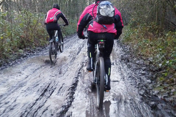 Roue arrière du cycliste de gauche pour passer la flaque.