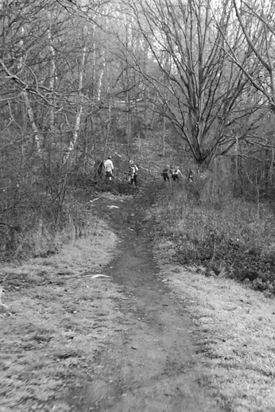 Entrée sur le terril de Leforest. A gauche, Jean Louis du VCF en route vers le haut de la première côte pour une séance de prise de vues. On reconnaît le photographe d’expérience au pliant porté en bandoulière.