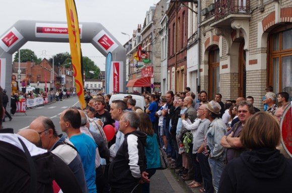 7h00, la foule de cyclistes contenue par des barrières s’ébranle et se répand dans Lille en un flux dense et continu. Je trouve que ce départ massif, s’il fait grande impression, n’est pas très judicieux. D’une part cette densité crée parfois des situations limites en termes de sécurité et d’autre part, elle donne vraiment l’impression d’être les uns sur les autres durant les trente premiers kilomètres. Un départ cadencé toutes les trente secondes par groupe de cinquante par exemple, serait je pense de nature a fluidifier le trafic tout en permettant à l’ensemble des participants de partir dans l’heure, comme actuellement. Cela éviterait aussi sans doute l’embouteillage au passage du portique d’enregistrement des puces.