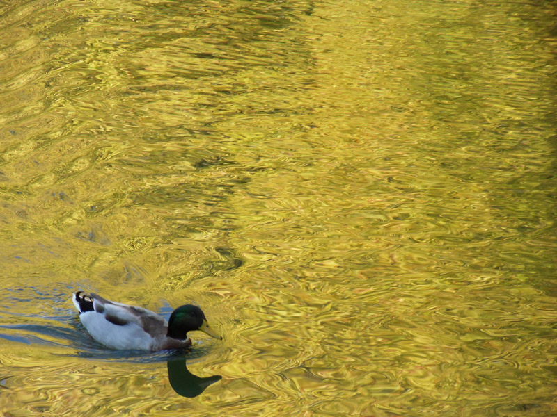 Pas d’effet Photoshop, seuls les reflets des arbres dans l’eau du canal créent ce fond chatoyant.