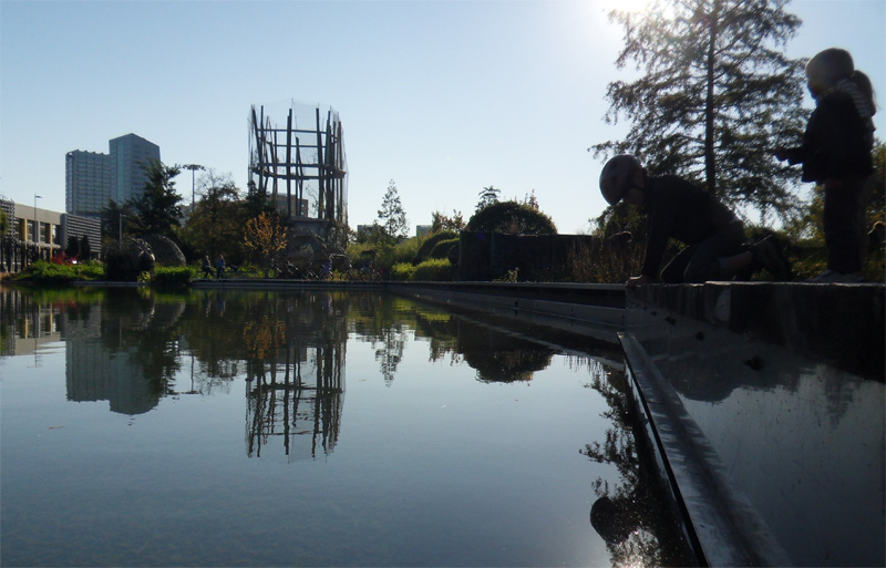 Le choix des végétaux, le découpage des allées, les plans d’eau offrent des perspectives et des ambiances variées. Tantôt cheminant sur des allées bordées de hauts bambous, le regard est enserré entre ces parois végétales. Tantôt plus à découvert, l’horizon s’ouvre sur la ville et les nouveaux immeubles à l’architecture résolument moderne. Une invitation à poursuivre mon périple vers ces quartiers que je ne traverse jamais.
