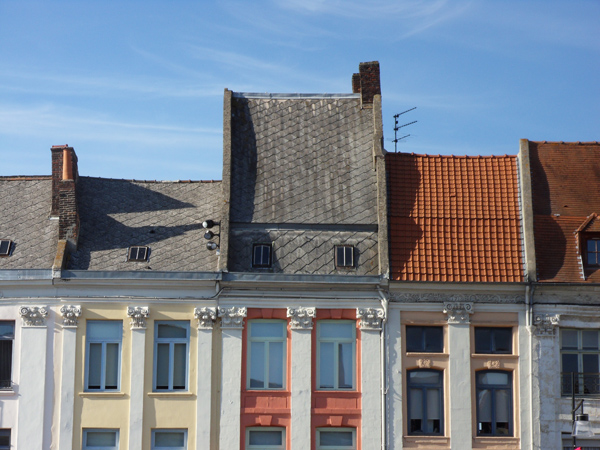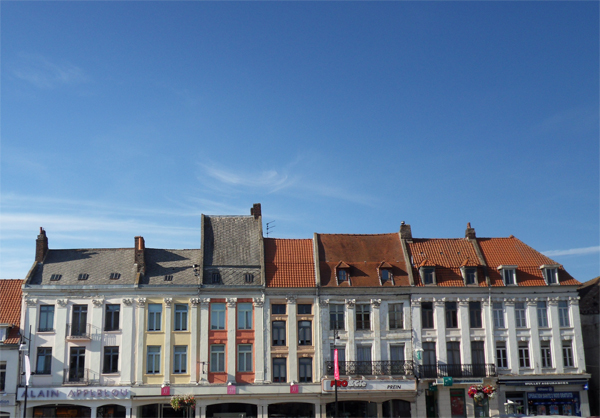 Rangée de maisons de la Grand Place d’Aire sur la Lys, relativement préservées des enseignes commerciales.