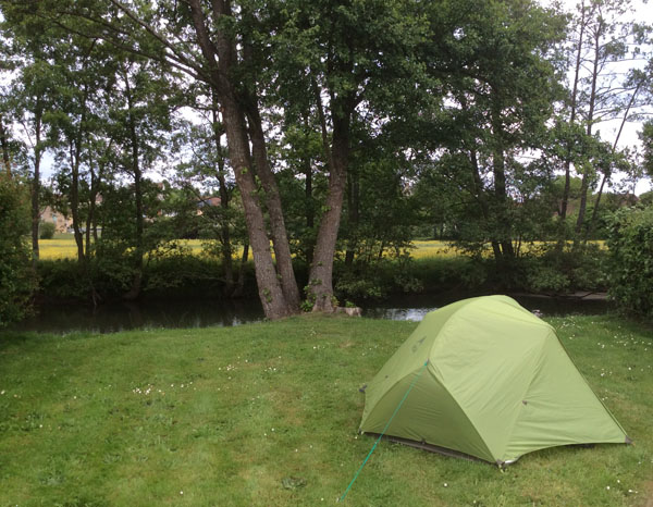 Je néglige la charmante aire de pique nique aménagée à hauteur de Dorceau pour faire halte peu après à Bellou sur Huisne. L’après-midi est déjà bien entamée et les terrains de camping ne sont pas pléthore. J’ai le choix le l’emplacement et opte pour une parcelle au bord de la calme rivière.