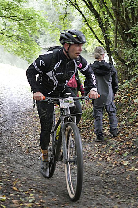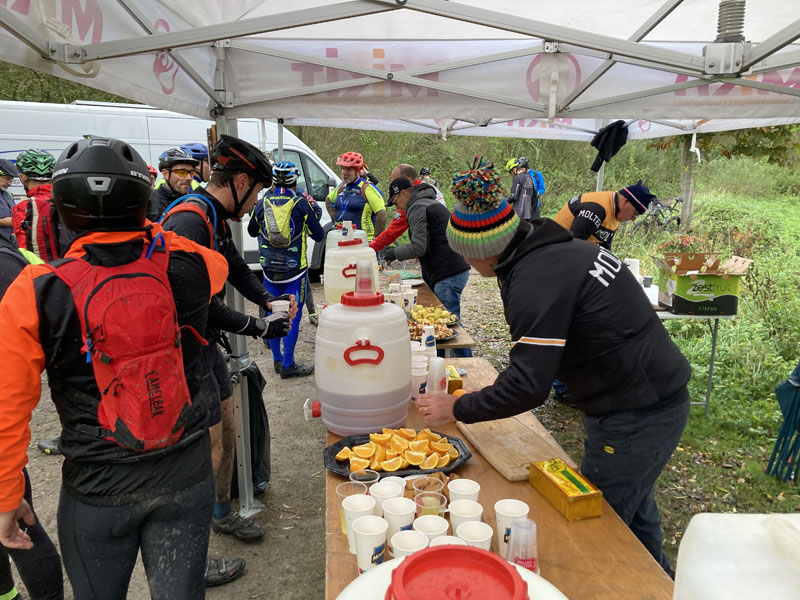 Pour le vététiste ascendant tout chemin que je suis, ce fut un parcours exigeant. J’étais, après le second pointage, prêt à bloquer mon compteur à deux tours. Finalement, parvenu au ravitaillement, quelques tranches de cake aux pépites de chocolat et la présence d’autres cyclistes prêts à s’engager sur un troisième tour me remirent en selle. Je parvins au contrôle avant sa fermeture mais dûs être un des derniers.