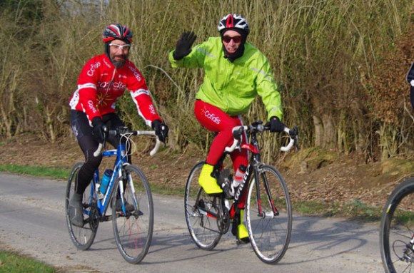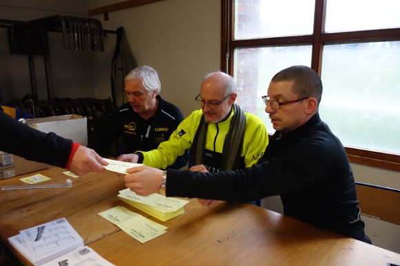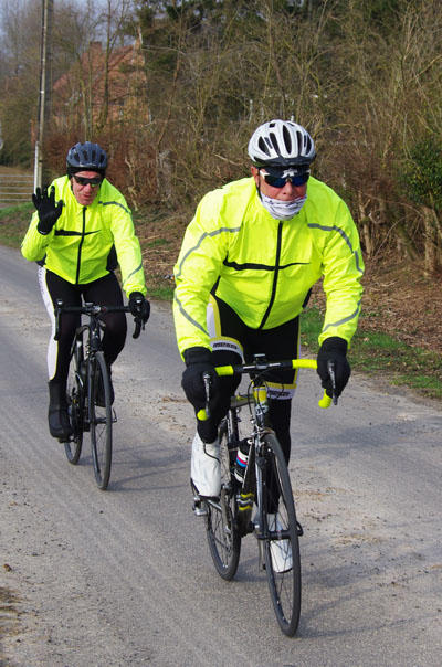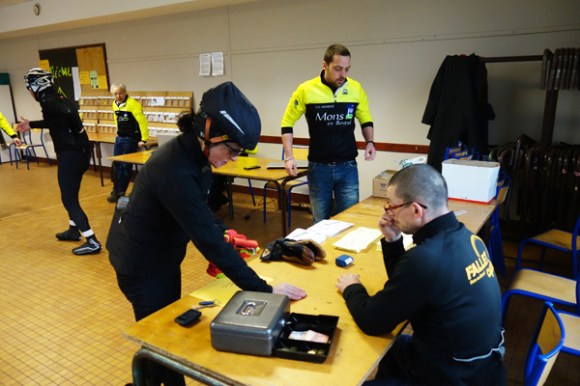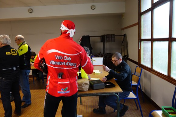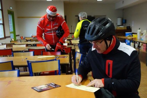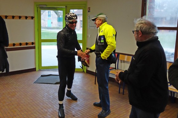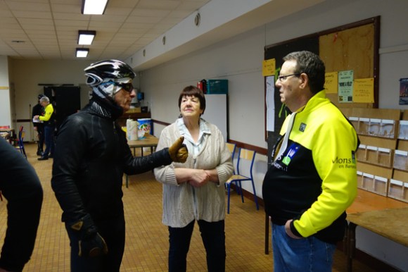 L’entame de cette chronique portera, comme l’an dernier, sur des considérations météorologiques et s’en distinguera par la fin. Si cette matinée fut venteuse et vivifiante comme la précédente, nous eûmes droit cette année à une belle giboulée. Vivifiante elle le fut doublement car le vent tout droit venu de Scandinavie était franchement frigorifiant. Ces conditions auront dissuadé nombre d’habitués de ce brevet de sortir de leur couette et nous n’aurons été que cent quarante à rouler sur les trois parcours proposés. Dommage, car le soleil, à condition que l’on fût convenablement équipé, rendait la température supportable.