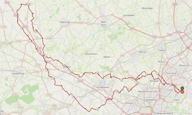 Mais revenons à notre itinéraire qui, partant par les Weppes, nous fait parcourir la Flandre Maritime pour revenir par les Monts. Conçue par Didier en période de Covid et d’interdiction de franchir la frontière, cette boucle de 166 km au départ de Roubaix se déroule vous l’aurez deviné… entièrement en France.