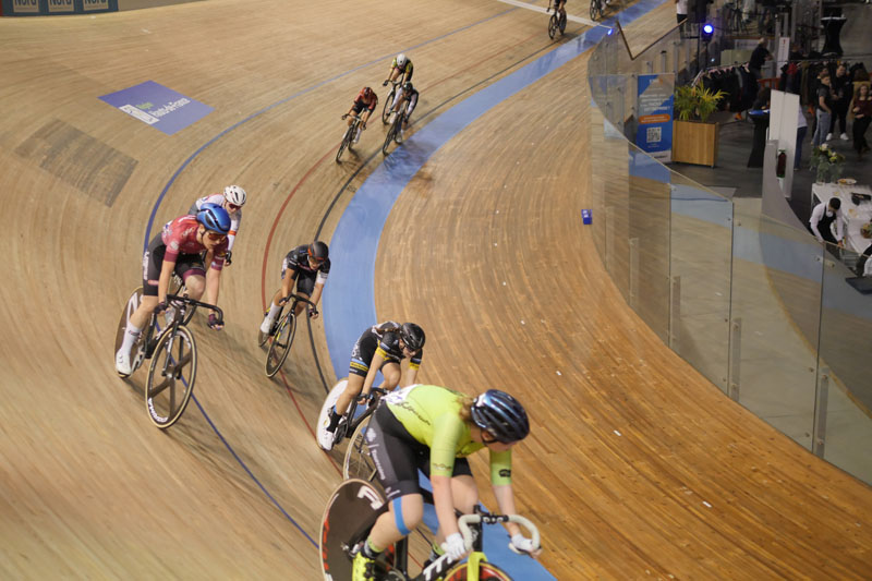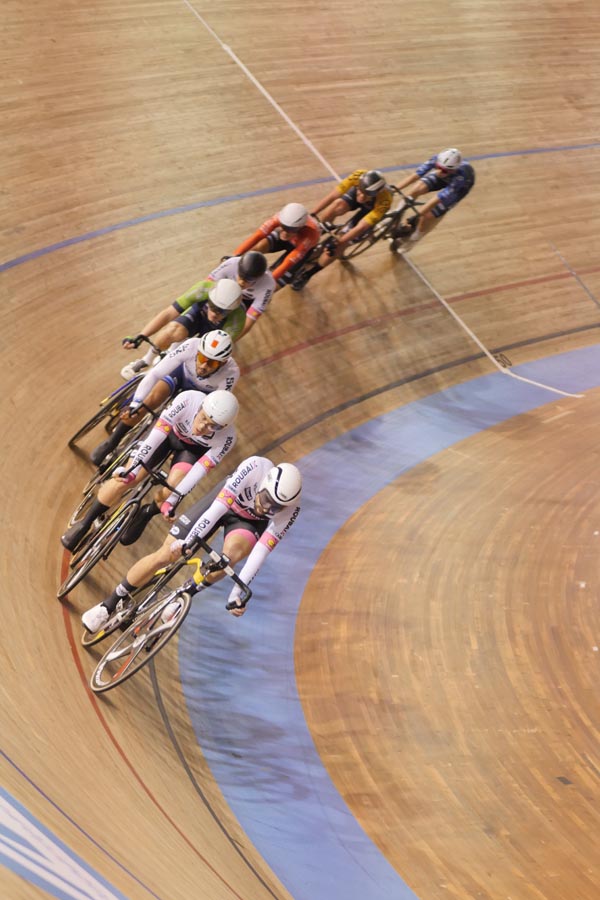 Départ de l’Elimination de l’Omnium F. Une ligne à la corde et une autre à la balustrade. Comme dans toutes les manches, le départ n’est donné qu’après que le peloton est formé, en général après un tour de piste.