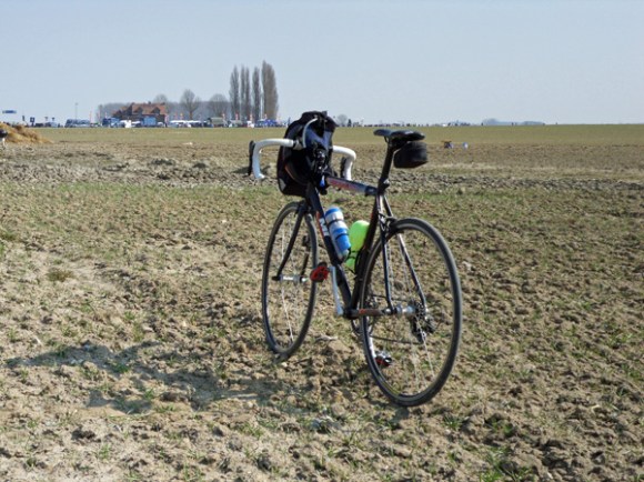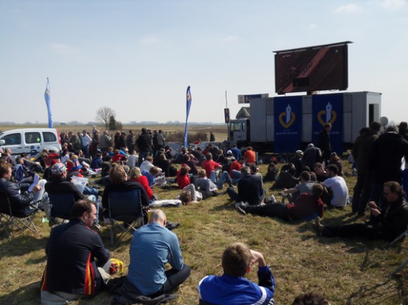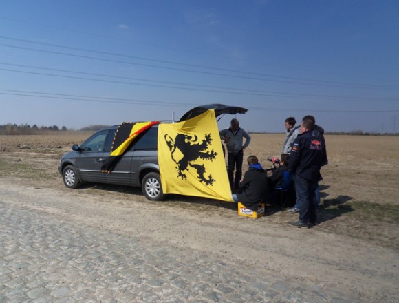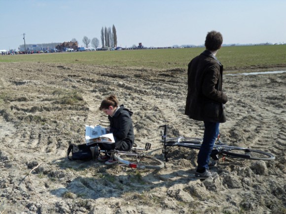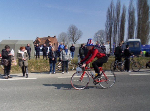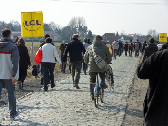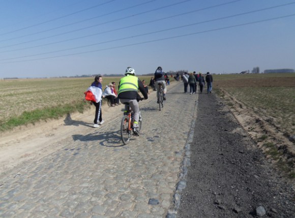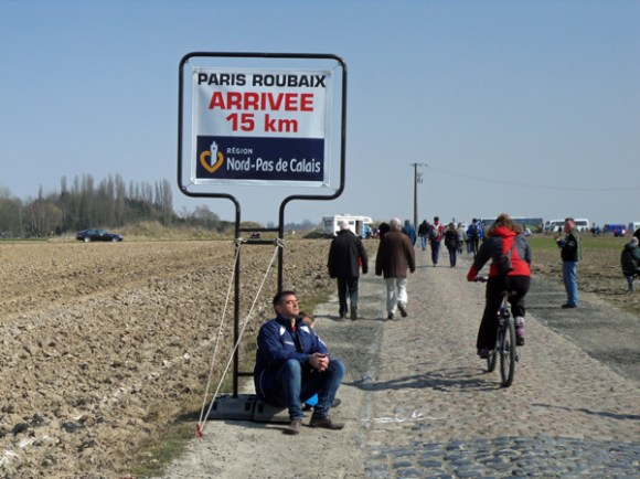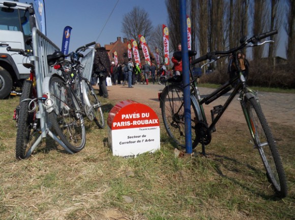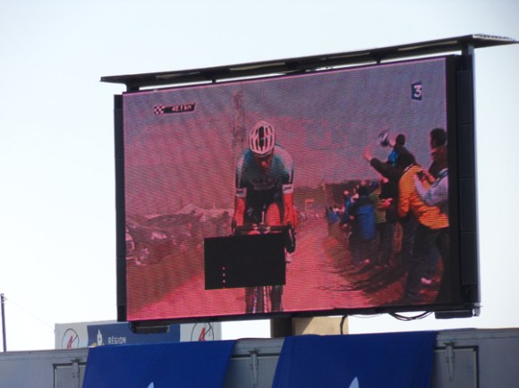 Ayant de l’avance, j’en profitai pour flâner jusqu’au mythique carrefour où trônait un écran géant aux couleurs de la Région Nord Pas de Calais, retransmettant la course. Par un temps ensoleillé et doux, la foule était nombreuse assise sur l’herbe pour suivre l’approche des coureurs.