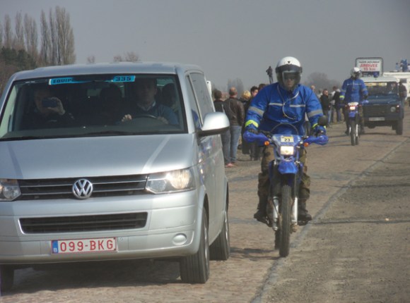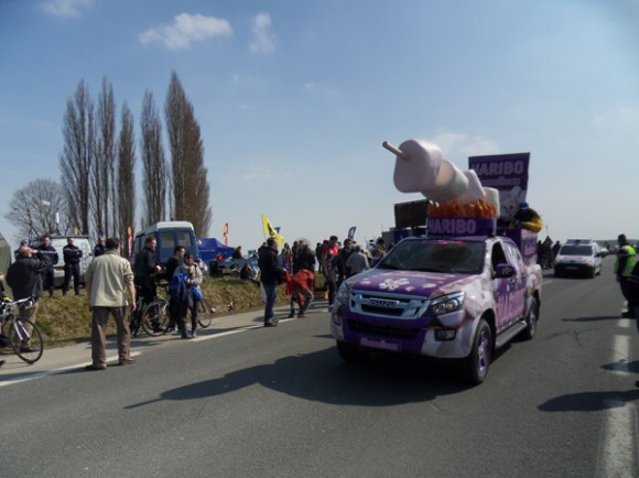 Je ne fus pas pris au dépourvu car j’avais choisi d’arriver à l’heure pour voir passer la caravane. Il faut l’avouer, ce qui me plaît dans Paris-Roubaix c’est davantage l »ambiance qui l’entoure que le passage des coureurs, réduit finalement à peu de temps.