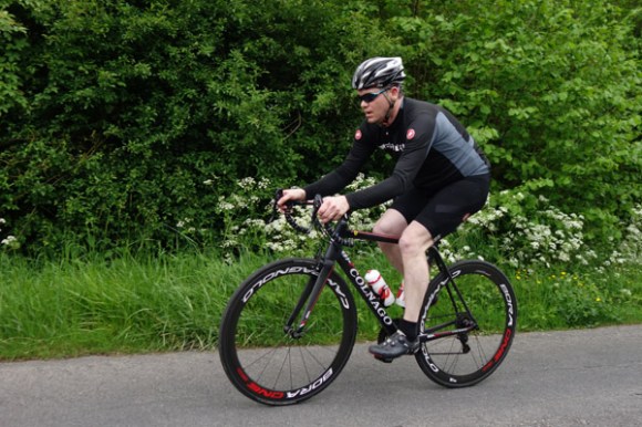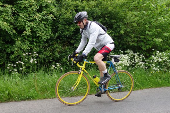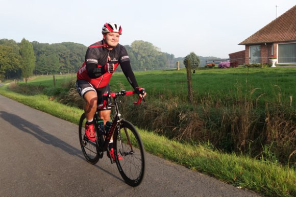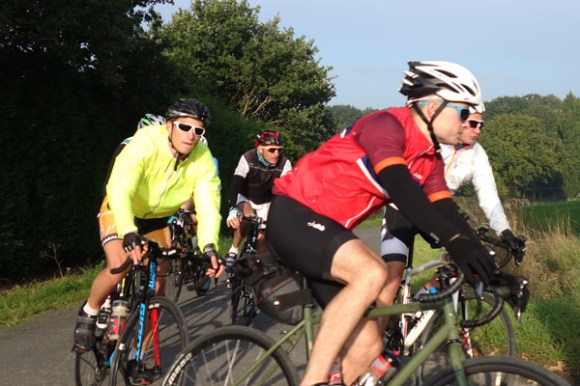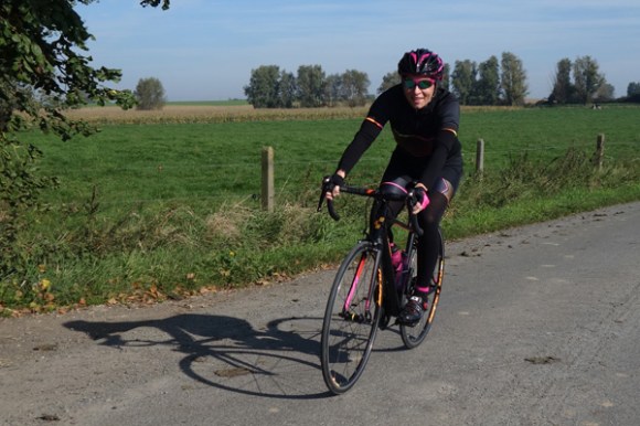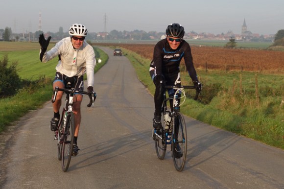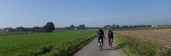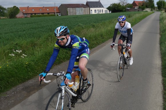 La semaine dernière, ils étaient photographiés de face, les voici de dos. Le cycliste de gauche montait un superbe Mercier rose de 1974, fortuitement assorti à ligne des 100 kilomètres de Steenwerck.