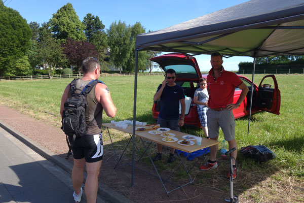 Ravitaillement de Phalempin : « Y a plus rien » me souffle le ravitailleur. Si quand même un verre de menthe à l’eau.