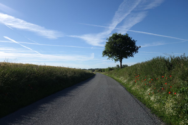 On quitte la ville par une belle montée qui, sans être le mur que laisse supposer le profil altimétrique qui figure sur le topo, n’en est pas moins raide. C’est un itinéraire en creux et bosses qui marque en effet la suite du voyage. Suivant des petites routes et rarement la ligne droite, l’alternance prévaut avec des pentes variables tant en pourcentage qu’en longueur.