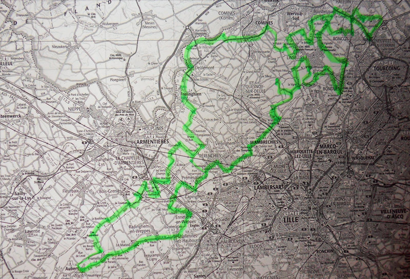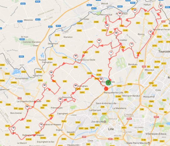 Vous trouverez la trace GPS sur Openrunner. M’étant engagé sur le 90 km malgré l’heure tardive suite à mes arrêts prolongés, je n’ai pas rejoint la salle une fois revenu à Wambrechies. La jonction ne pose pas de problème.