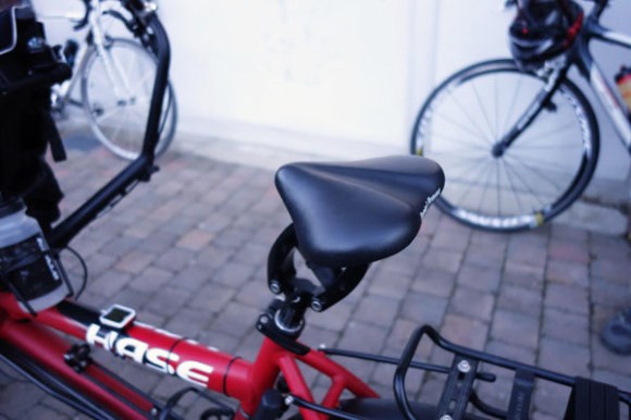 Voilà la bête. Hybride de tandem et de vélo assis. Pédalage autonome pour chacun des cyclistes. 25 kg, possibilité d’accrocher six sacoches. Heureusement il est équipé de freins à disques. Dans les descentes une fois chargé, cela peut être utile.